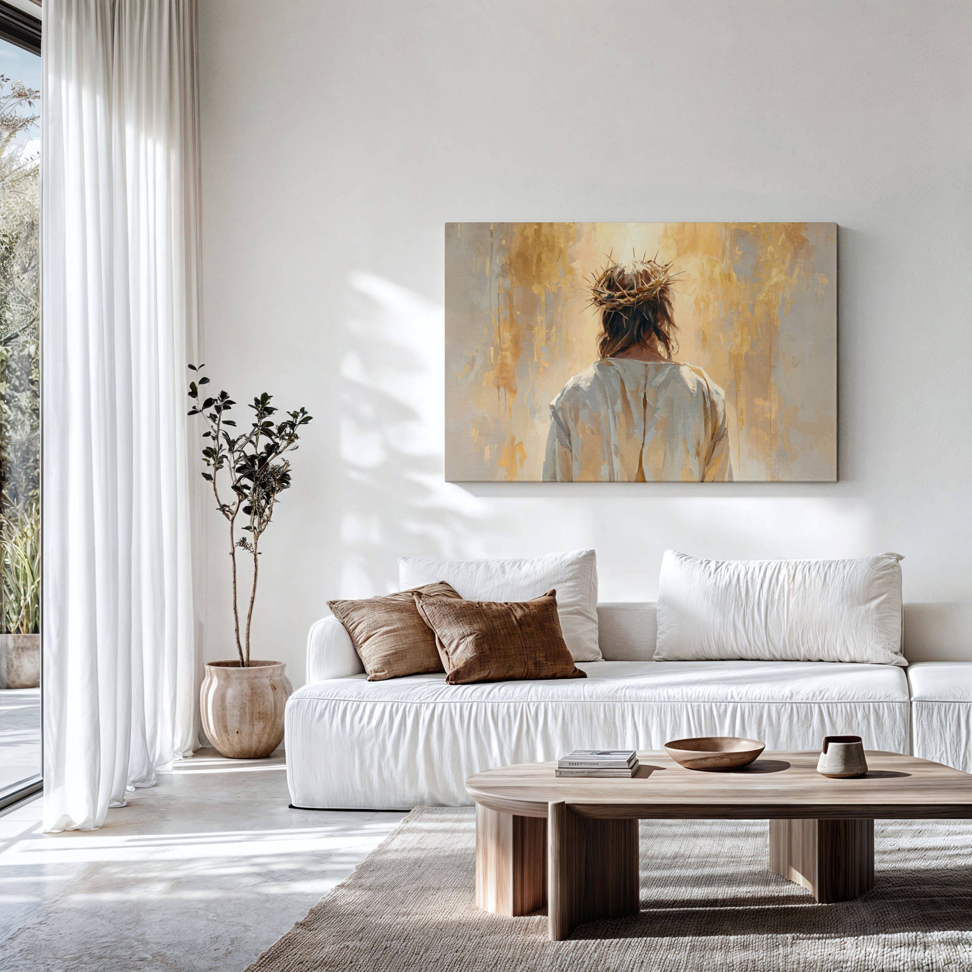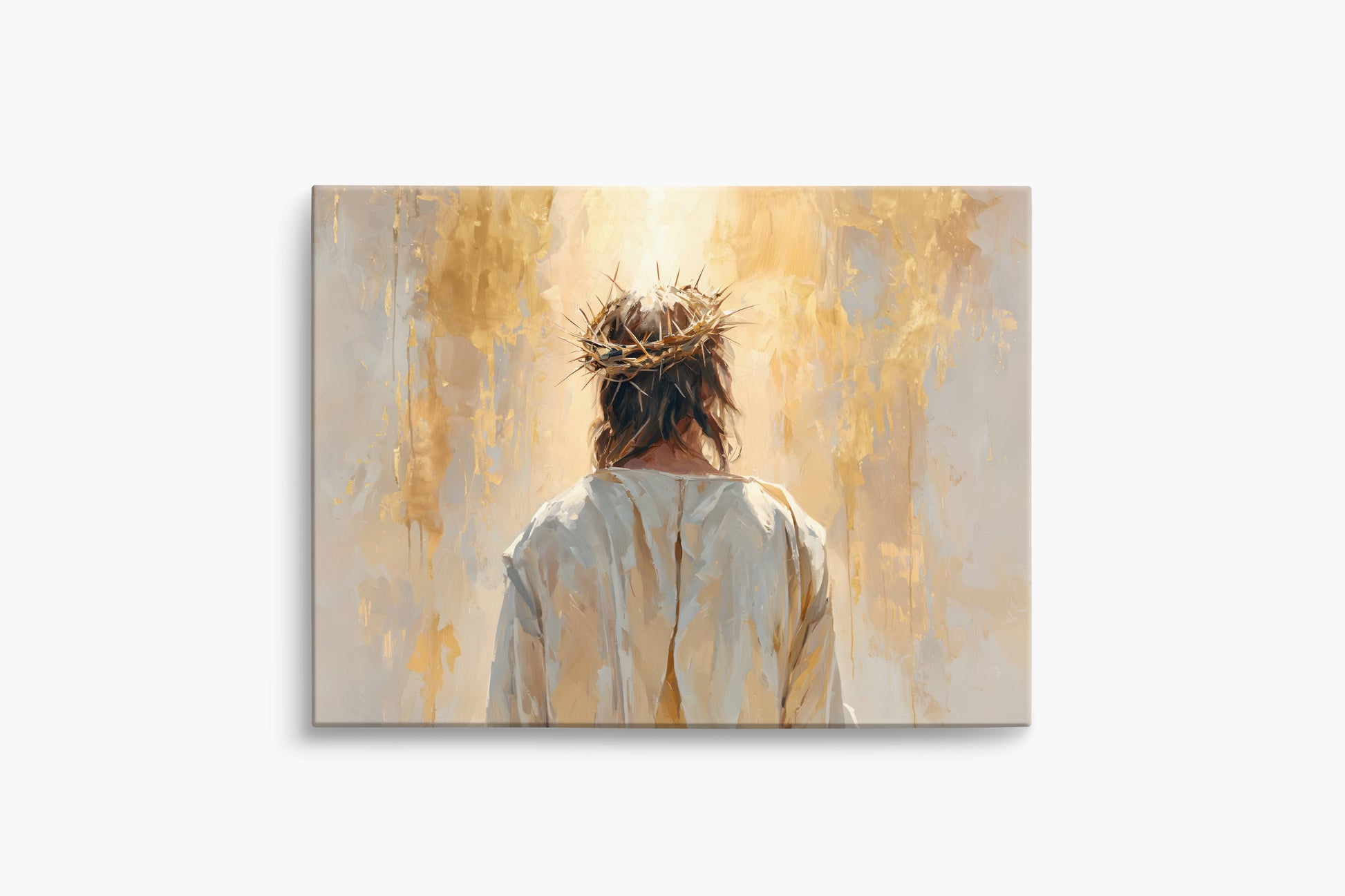 This moving piece shows Jesus from behind, clothed in humility and wearing the crown of thorns. Golden light surrounds Him, contrasting the pain He bore with the glory of what it accomplished.