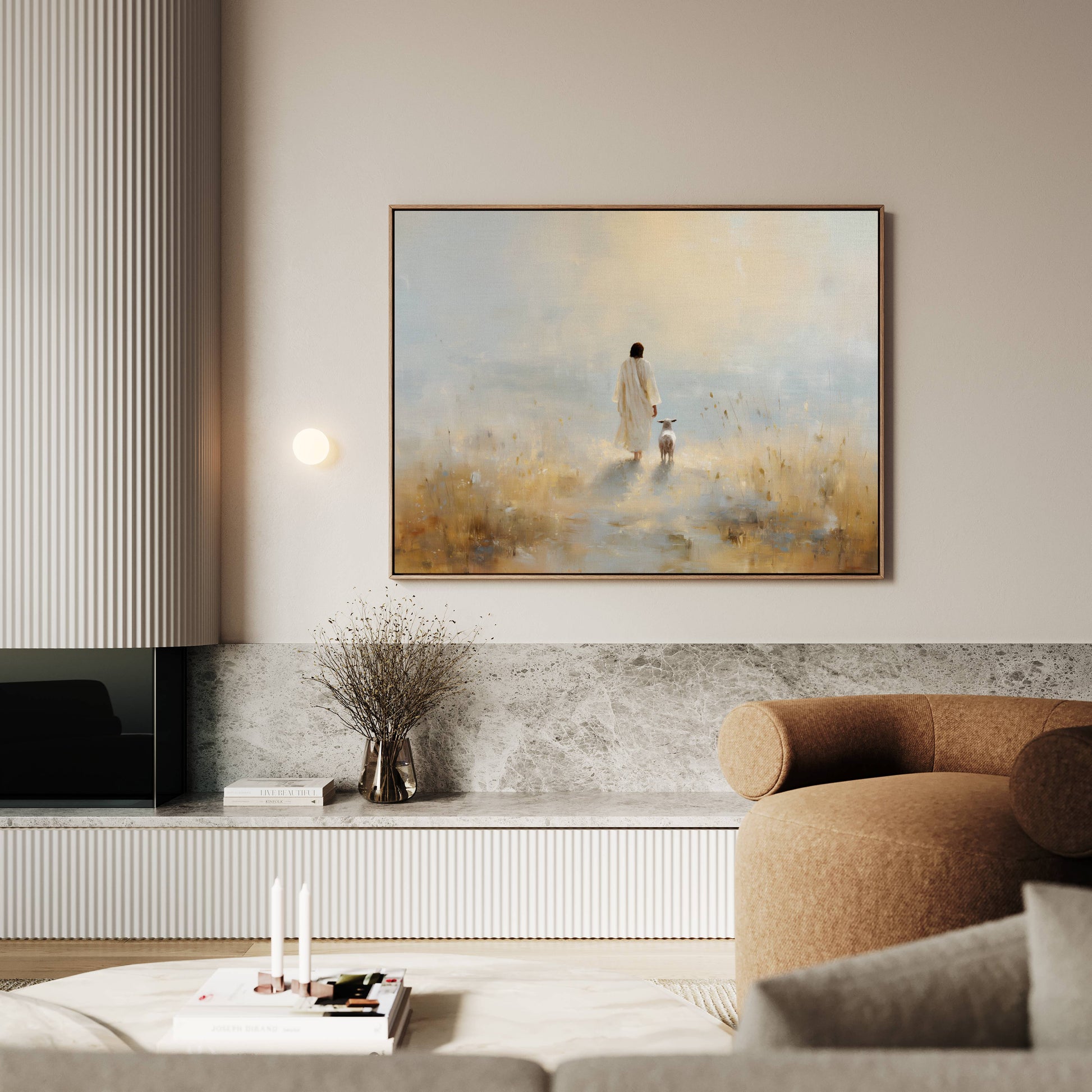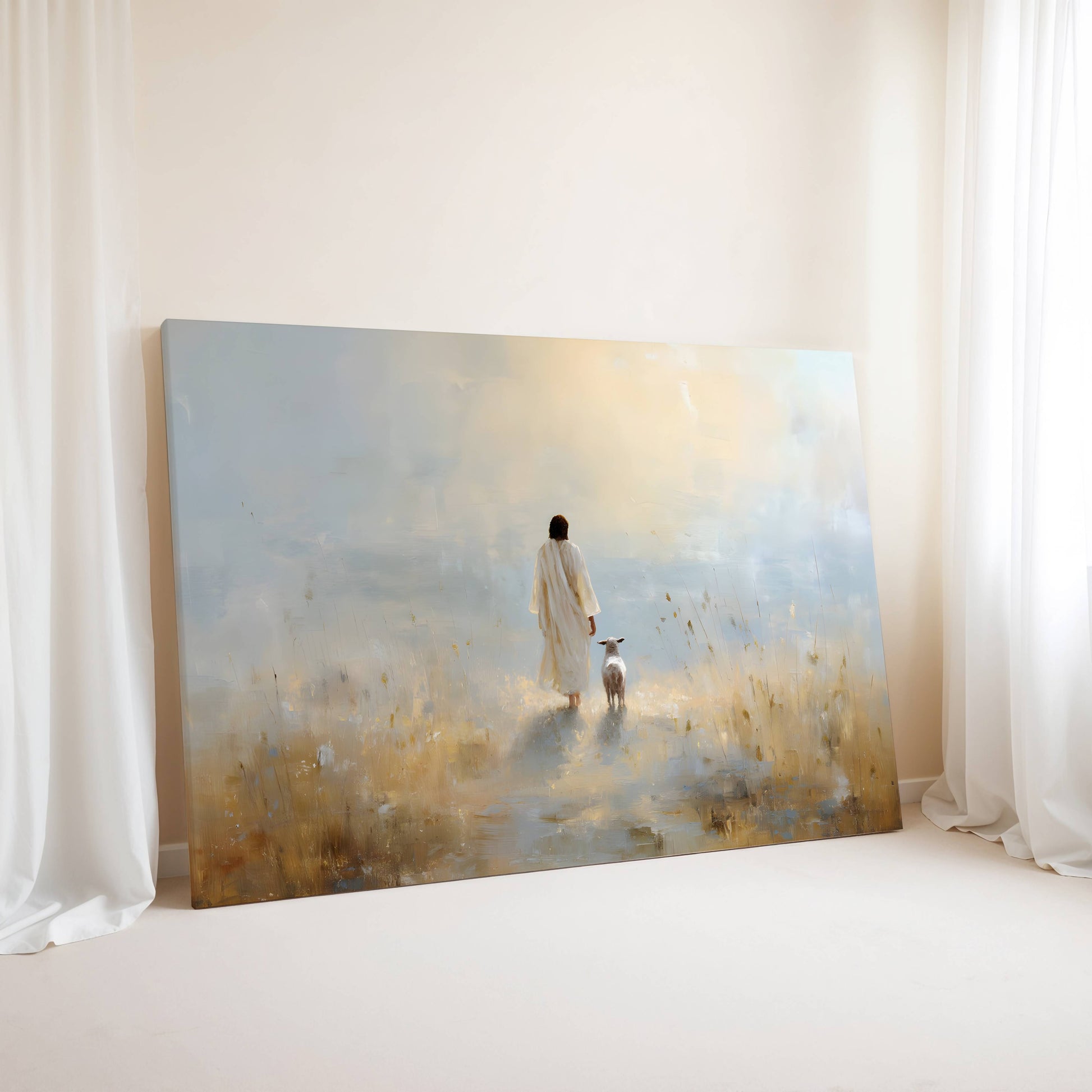 This touching artwork captures the heart of Luke 15:4—the Good Shepherd leaving the ninety-nine to rescue the one lost sheep. With soft golden hues and an open path ahead, it reflects Jesus’ deep love and personal pursuit of each of us.