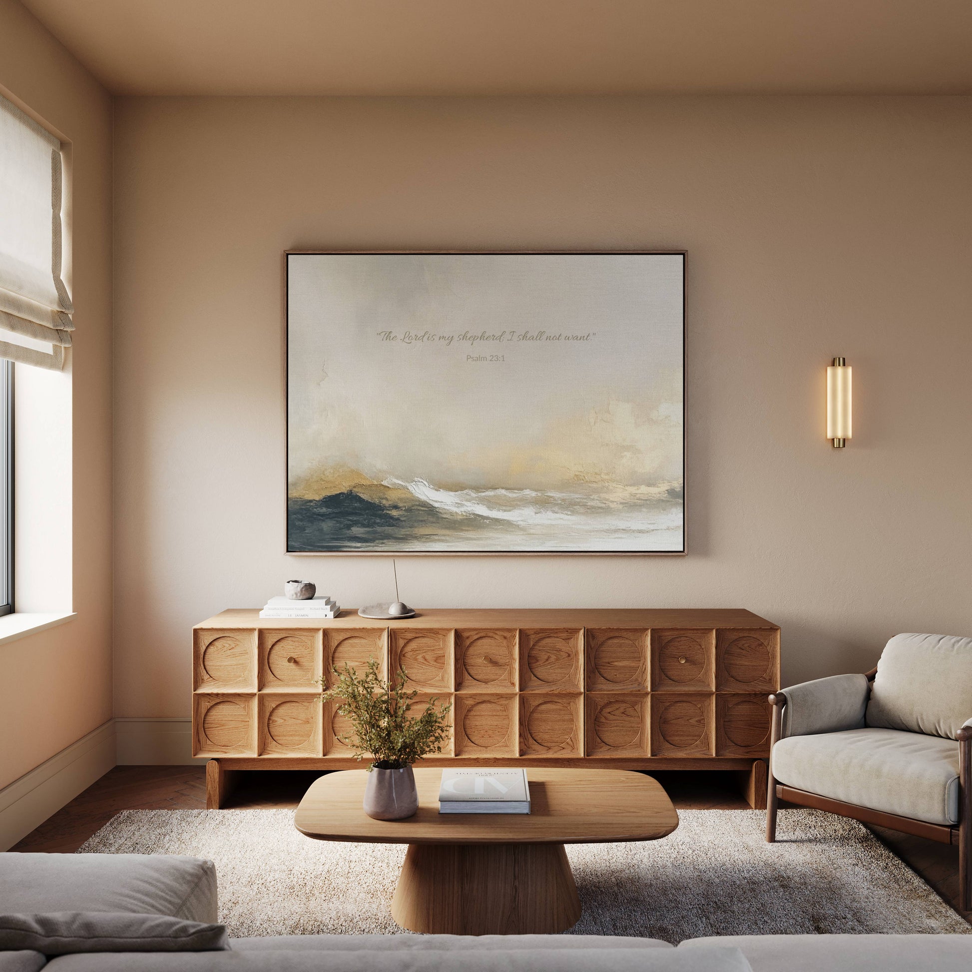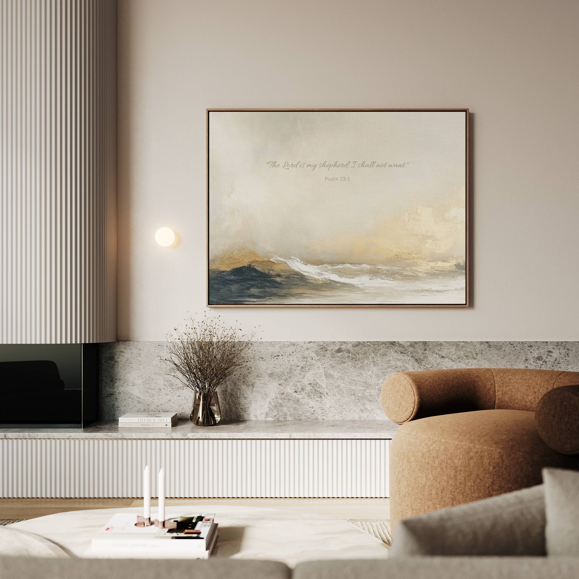 Soft waves crash against a golden, misty shore—quiet and majestic, like the steady presence of a loving Shepherd. The textures flow gently, evoking calm, safety, and provision even in the unknown.