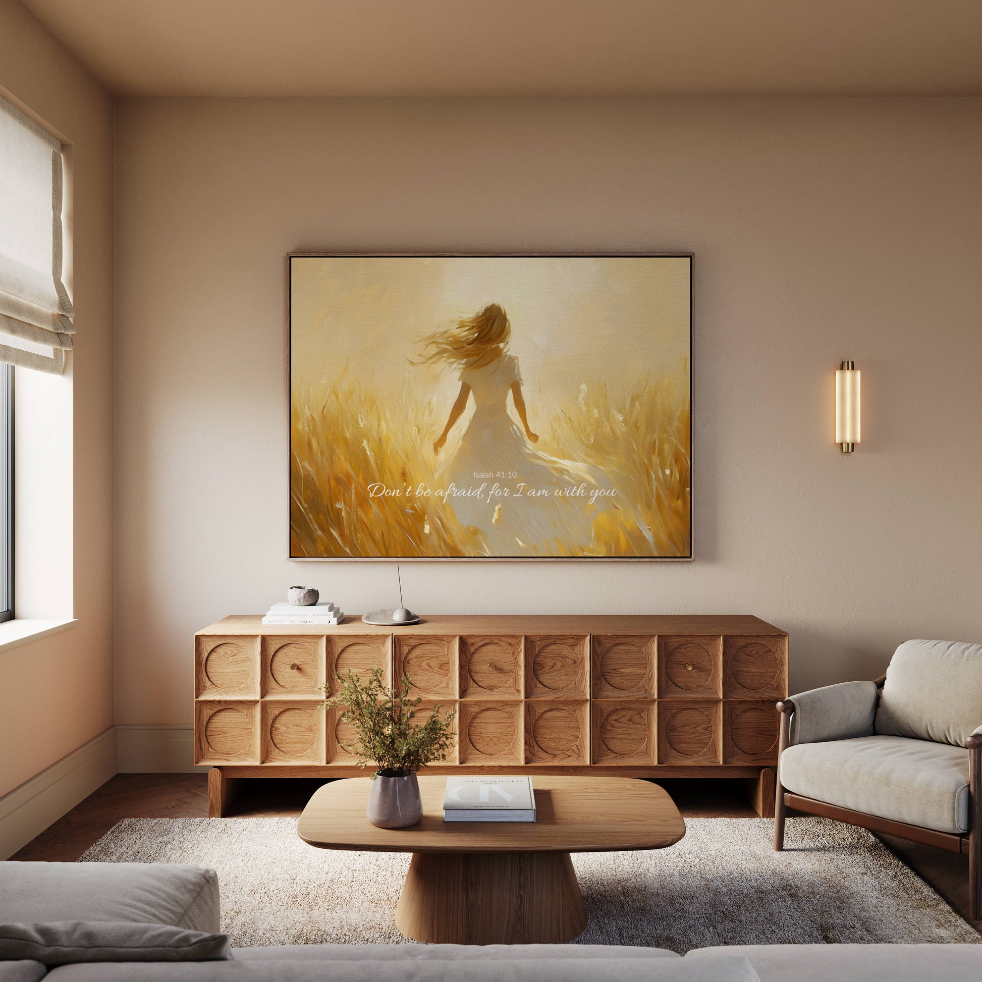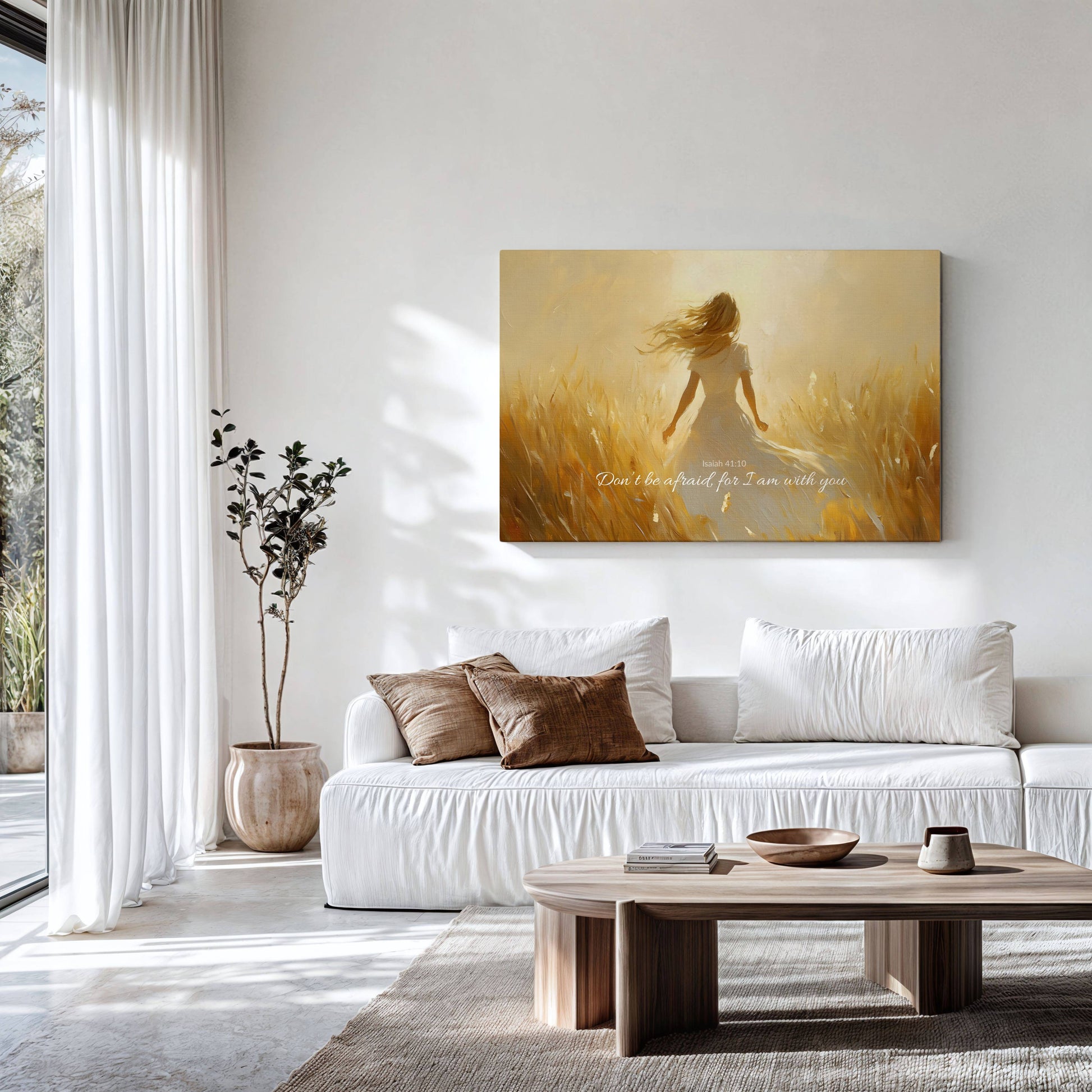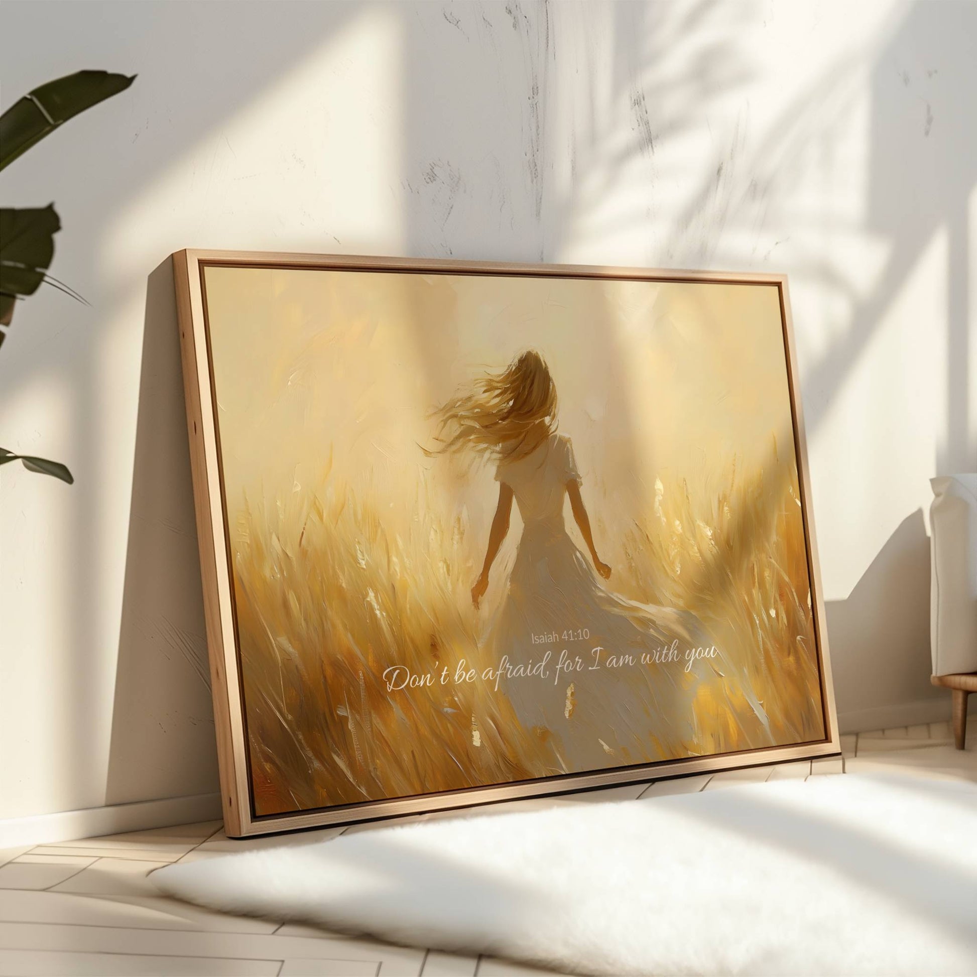 Bathed in golden light, a woman walks fearlessly into the field—clothed in peace, drawn by hope. The verse from Isaiah 41:10 gently reminds us: