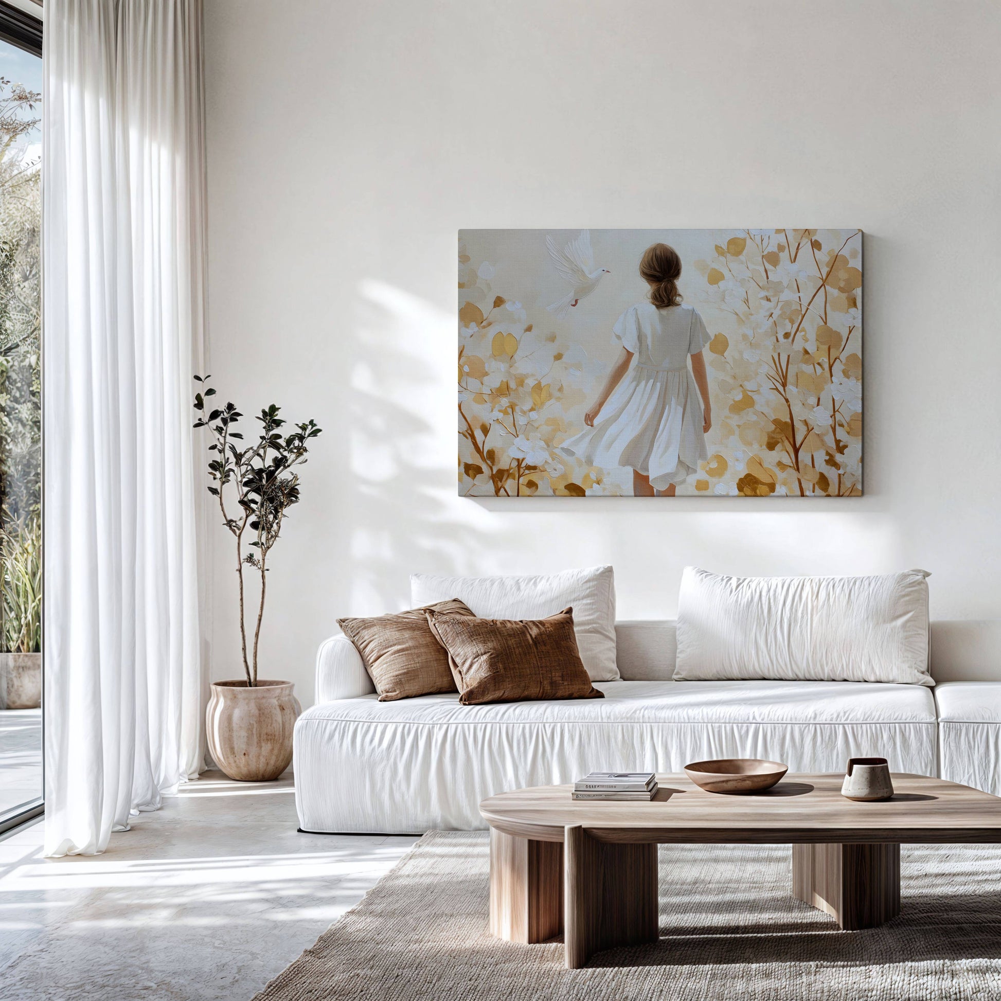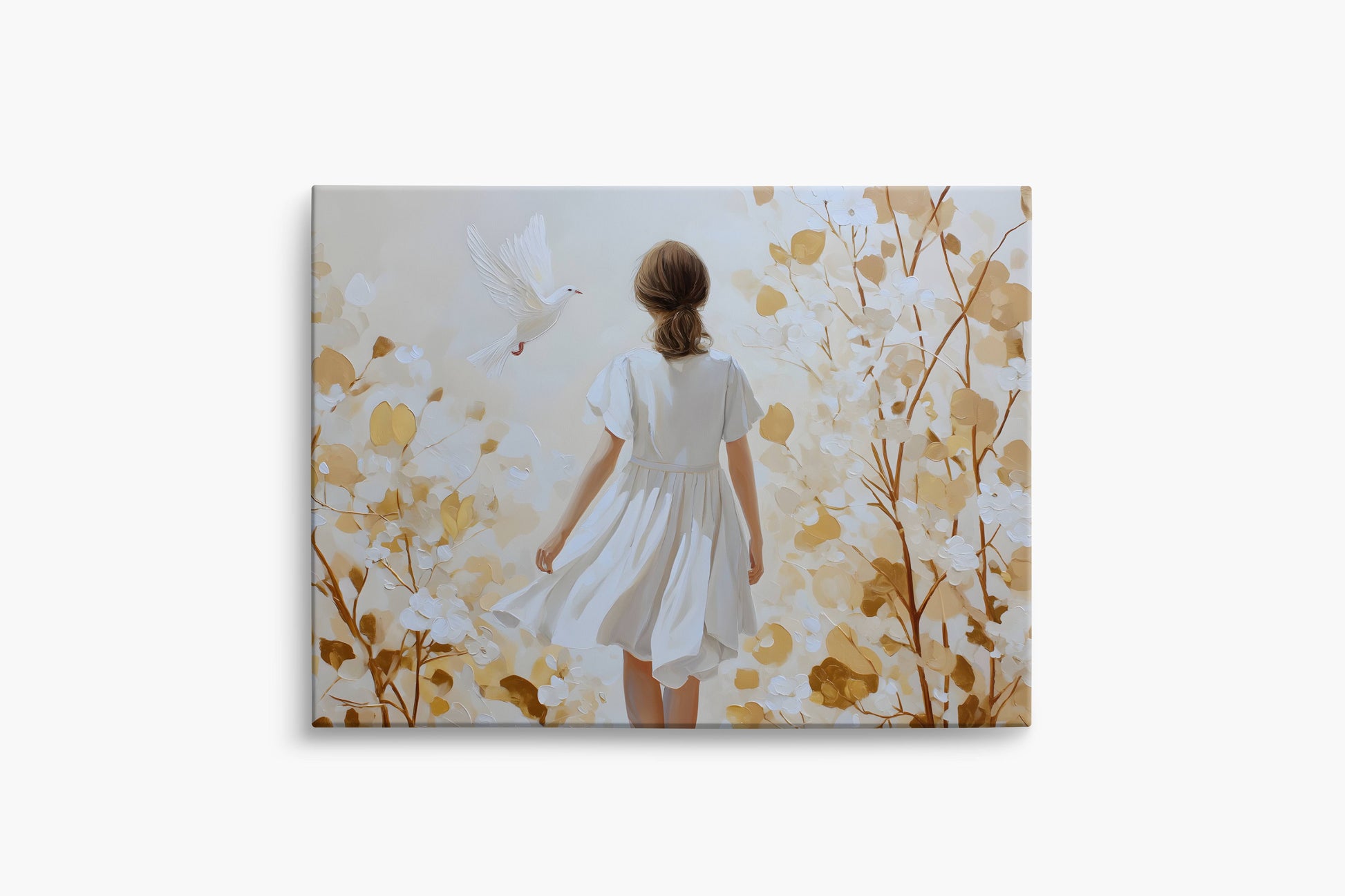 This uplifting artwork captures the tender guidance of the Holy Spirit, symbolized by a white dove soaring toward the light. The woman walks forward through a field of white and gold blossoms, representing purity, renewal, and the beauty of a life surrendered to God’s leading.