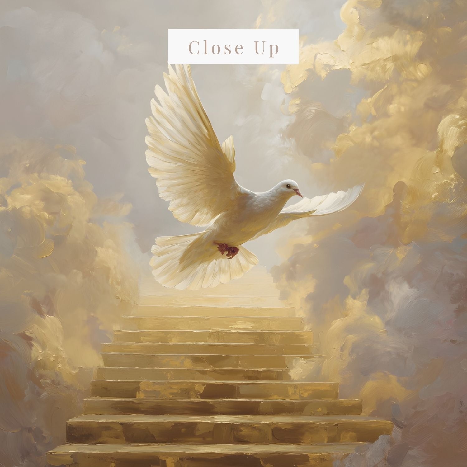 This radiant painting captures a pure white dove ascending a golden staircase through the clouds, symbolizing the Holy Spirit leading the way to Heaven. The staircase evokes divine invitation, hope, and the path of salvation—reminding us that we’re never alone in the journey. The scene glows with heavenly light, pointing toward the promise of eternal life.
