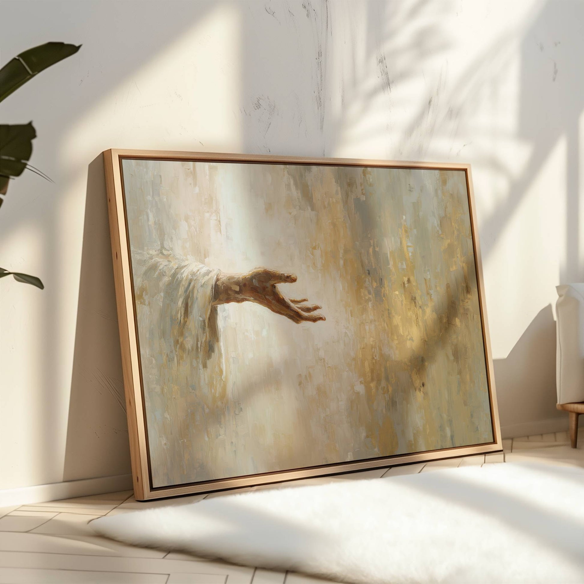 Perfect for prayer spaces, living rooms, or as a gift of encouragement, this artwork anchors the truth that you are never alone—His hand will always find yours.