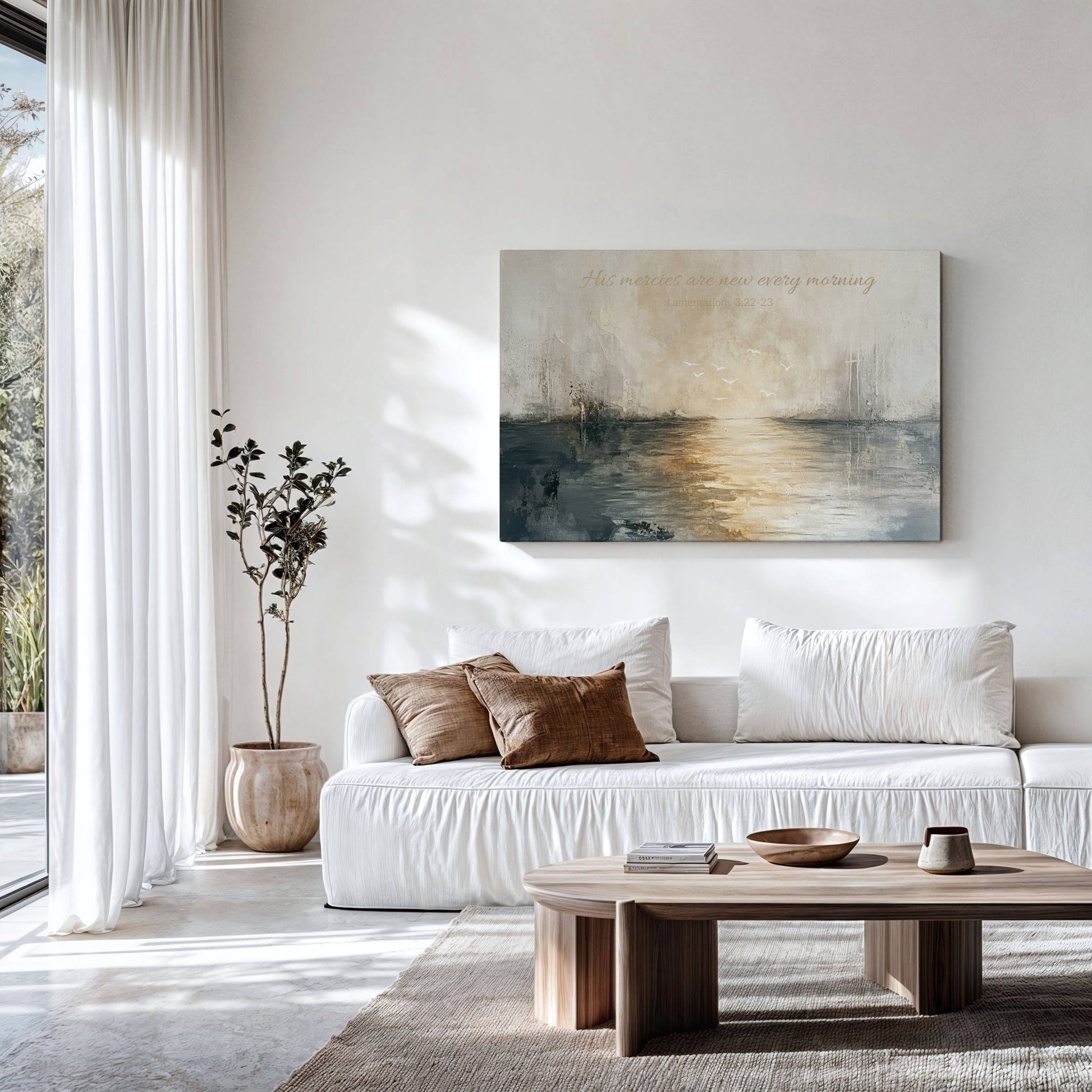 New Every Morning is a soft, peaceful canvas inspired by the promise of fresh mercy with each sunrise. Featuring a golden dawn over still waters and the uplifting words of Lamentations 3:22-23, this artwork invites your soul to rest and begin again, daily anchored in God's love.