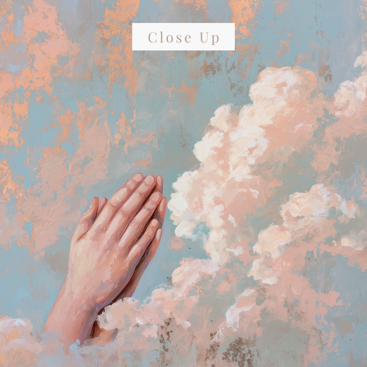 The soft, folded hands rise among glowing clouds, symbolizing trust, surrender, and hope lifted to heaven. The warm tones of peach, blue, and gold create a peaceful atmosphere, making it a gentle reminder of the power of prayer in our daily walk with God.