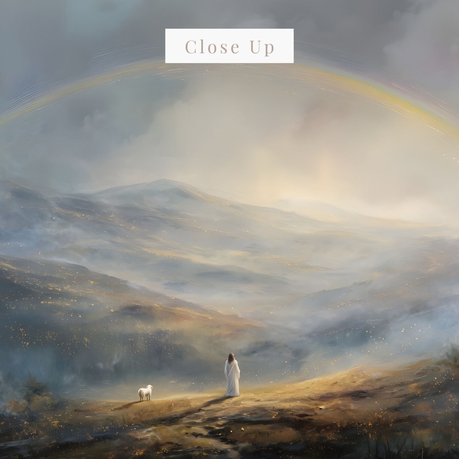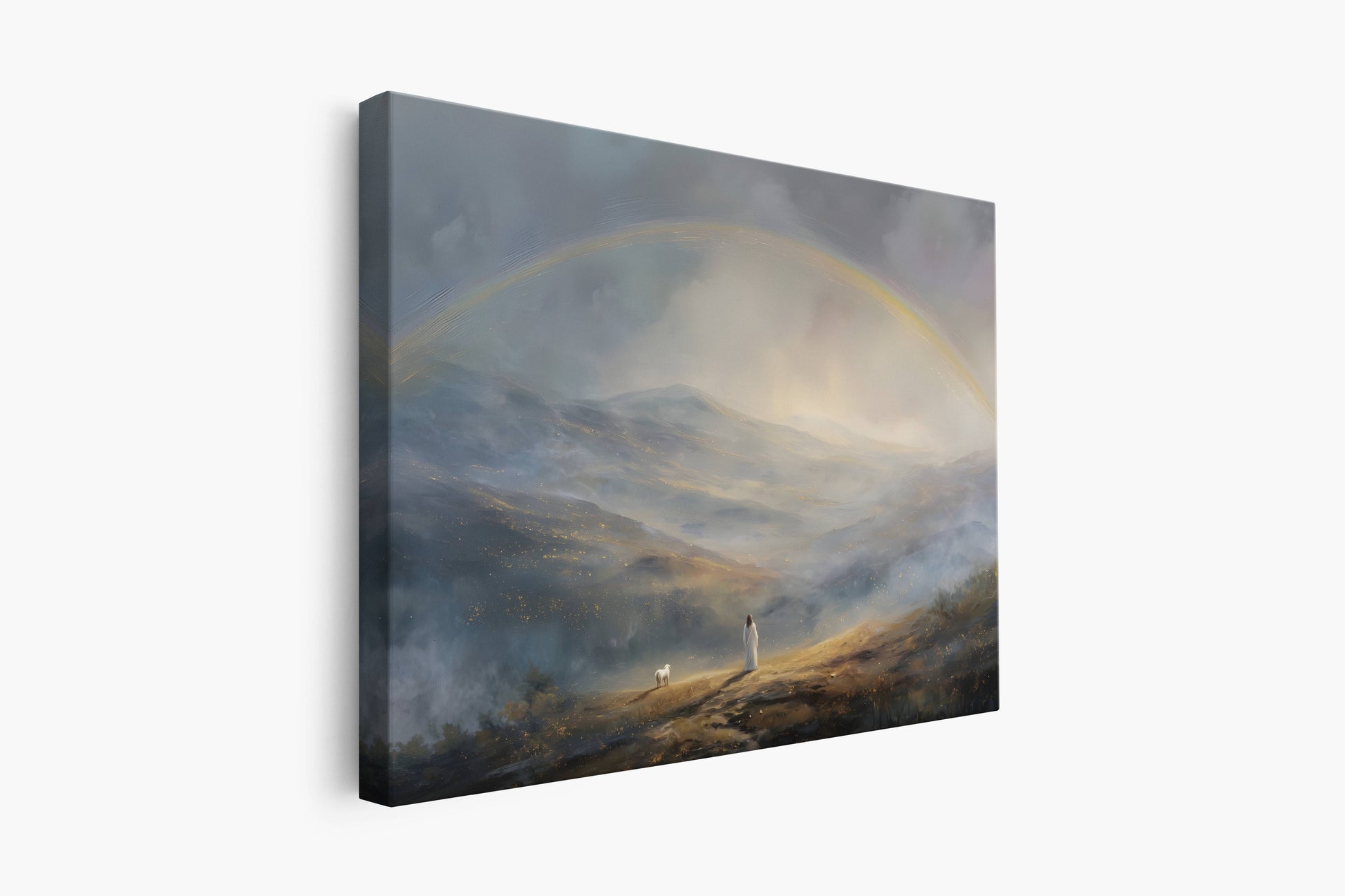 Beneath a soft and glowing rainbow, Jesus walks gently through the valley—His robe flowing, His steps steady. A lone lamb follows, bathed in the same golden light that touches the hills, a symbol of innocence, trust, and divine companionship.