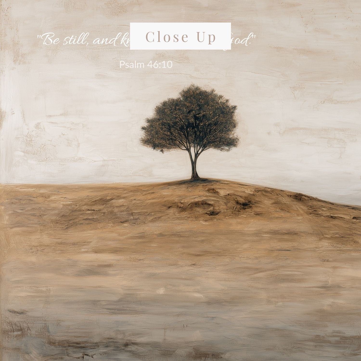A solitary tree stands rooted on a quiet hill, surrounded by soft tones of earth and sky. There is no rush, no noise—only the peace that comes from surrender.