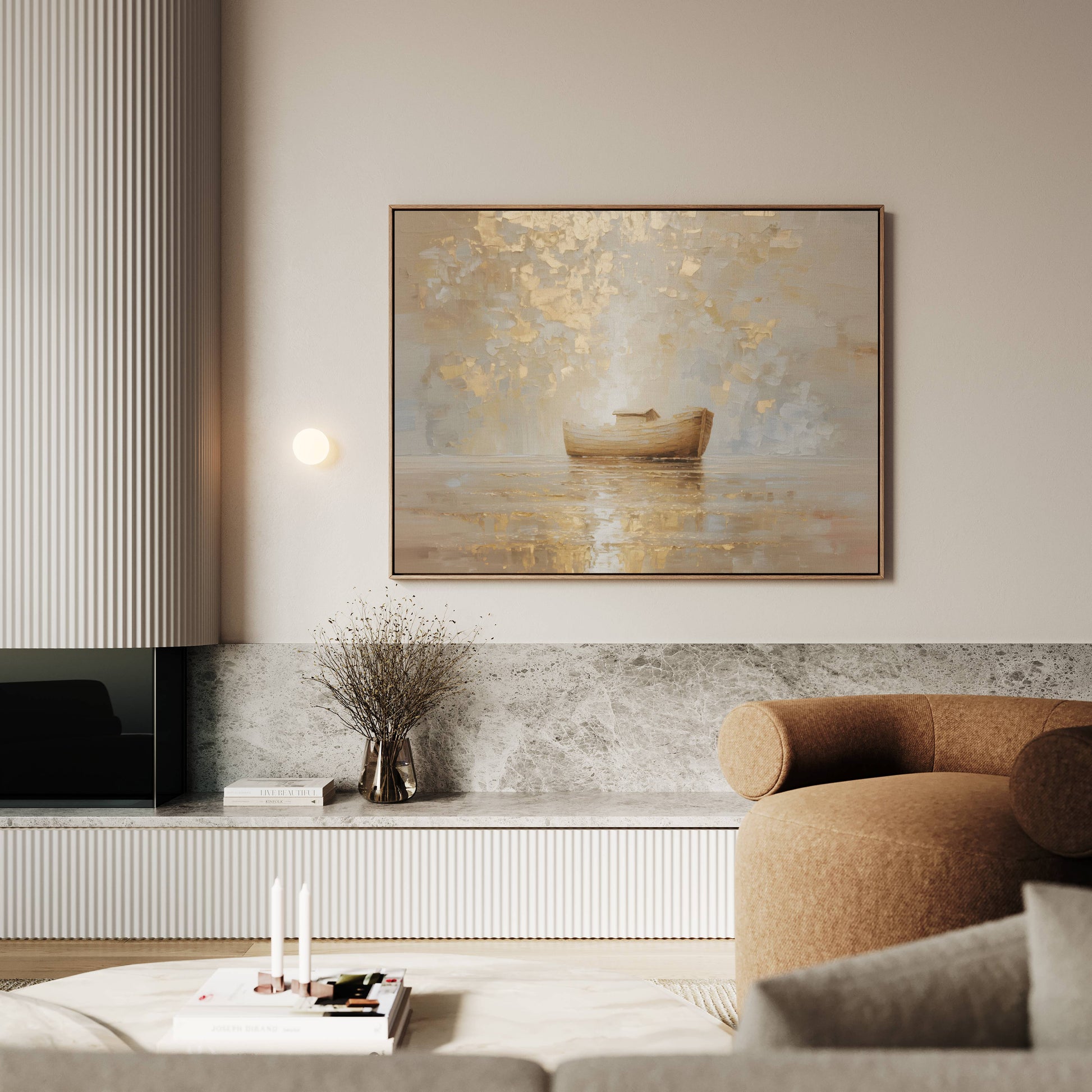 This elegant artwork captures Noah’s Ark resting upon calm waters, surrounded by warm, golden light—symbolizing God’s protection, faithfulness, and covenant promise.