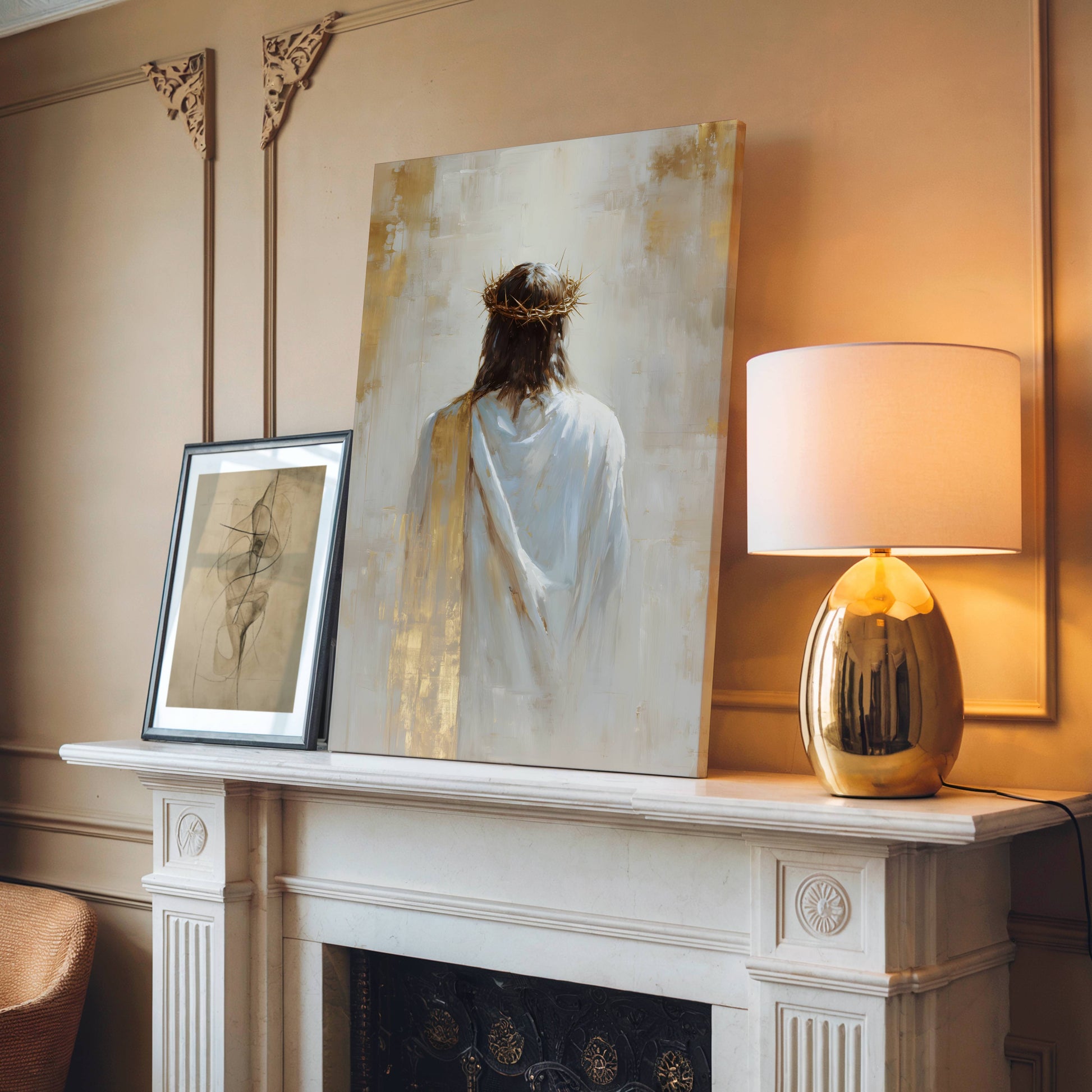 For added elegance and contrast, choose an handcrafted wood frame in your choice of Gold, Black, Oak, White, or Walnut—each one designed to complement your canvas and elevate your home. Framing your piece brings a refined, museum-quality look that helps you create a Christ-centered home filled with warmth, beauty, and meaning.