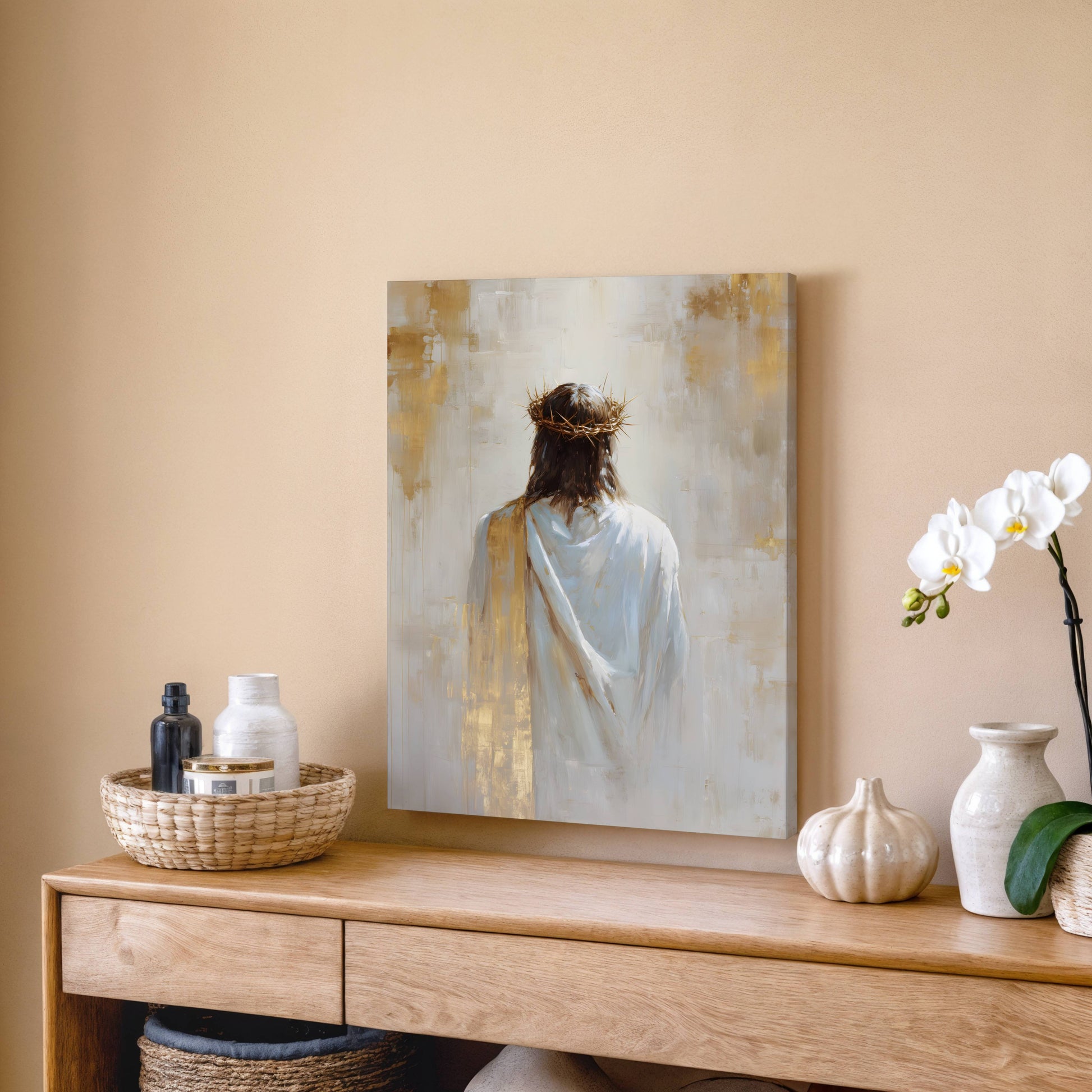 This minimalist painting captures Jesus from behind, clothed in white and crowned with thorns. The soft light and golden accents contrast the sorrow of suffering with the promise of hope and redemption.