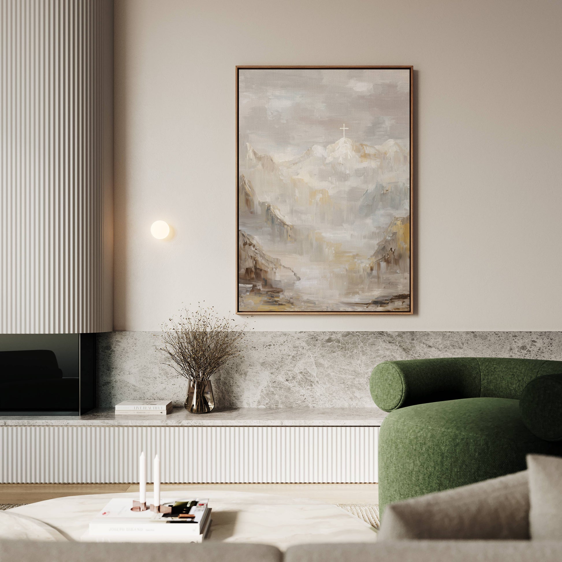 This artwork represents the journey of faith—the climb, the struggle, and the hope that waits at the highest point. The cross at the summit stands as a symbol of victory through Christ, reminding us that no mountain is too high when we walk with Him.