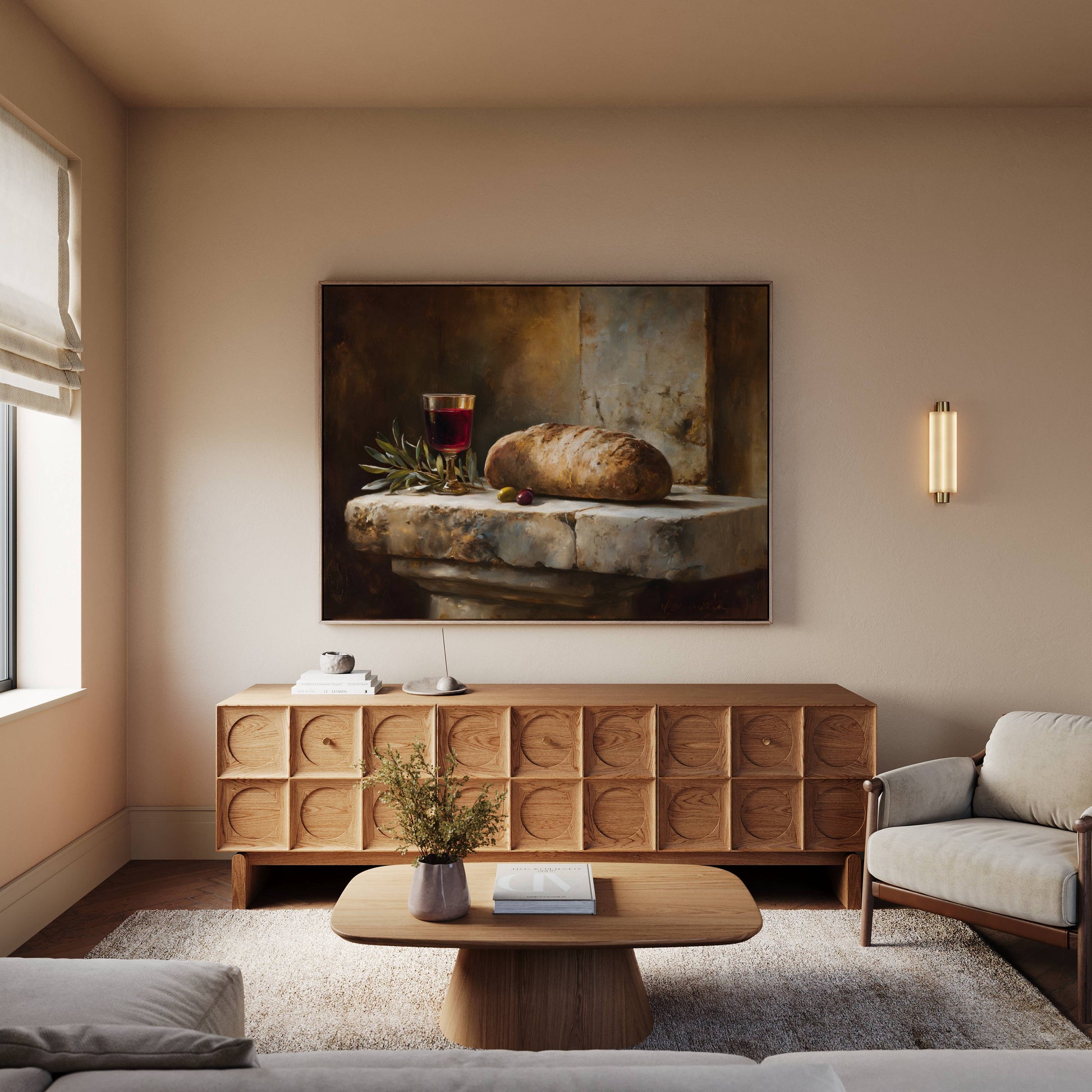Inspired by Luke 22:19 and the sacred tradition of communion, The Table of Grace invites reflection on Christ’s ultimate sacrifice. The bread and wine symbolize His body and blood—given freely so we may live. The olives and stone altar root this moment in history, yet its meaning remains eternal.