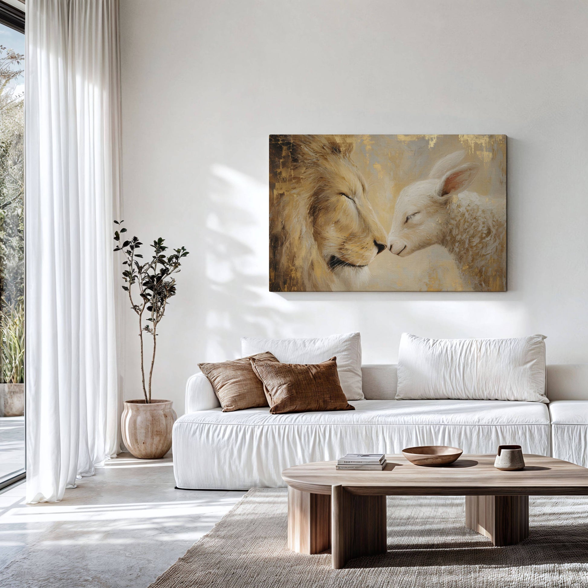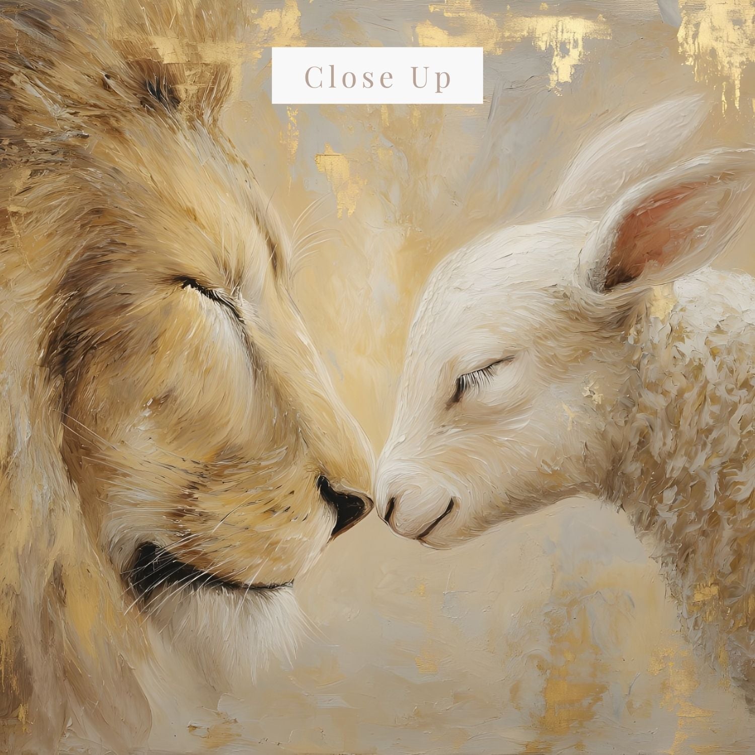 The gentle meeting of the lion and the lamb reflects Christ’s dual nature—unmatched authority paired with perfect humility. Here, strength does not dominate; it rests. Power does not destroy; it protects. The warm, golden tones and soft textures invite stillness, reminding us that God’s greatest triumph came through peace, obedience, and mercy.