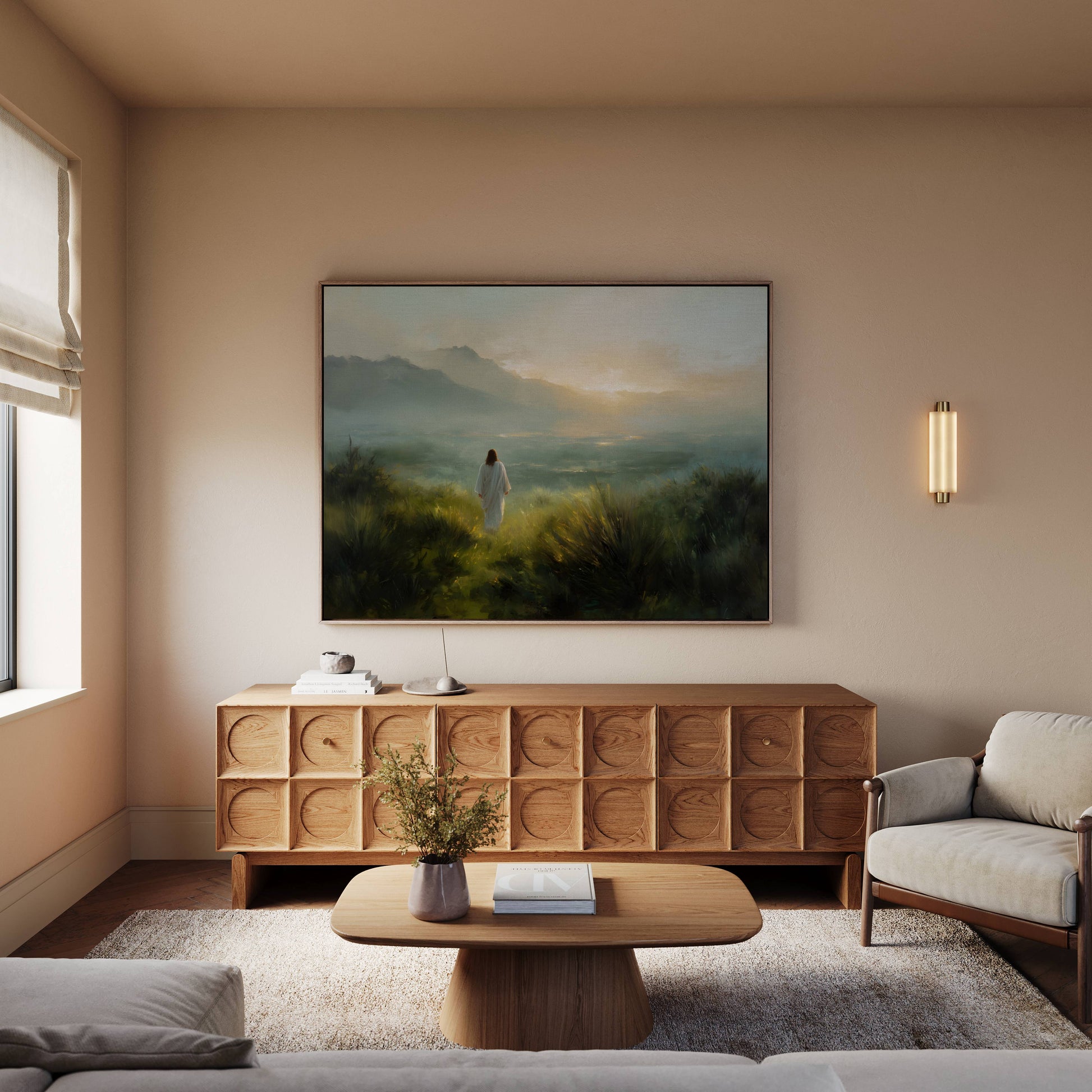 This stirring artwork captures a moment of quiet surrender—Jesus walking into the valley below, led only by the light ahead. The mist still lingers, the hills are steep, and the journey is unknown… but He walks forward with full trust in the Father’s plan.
